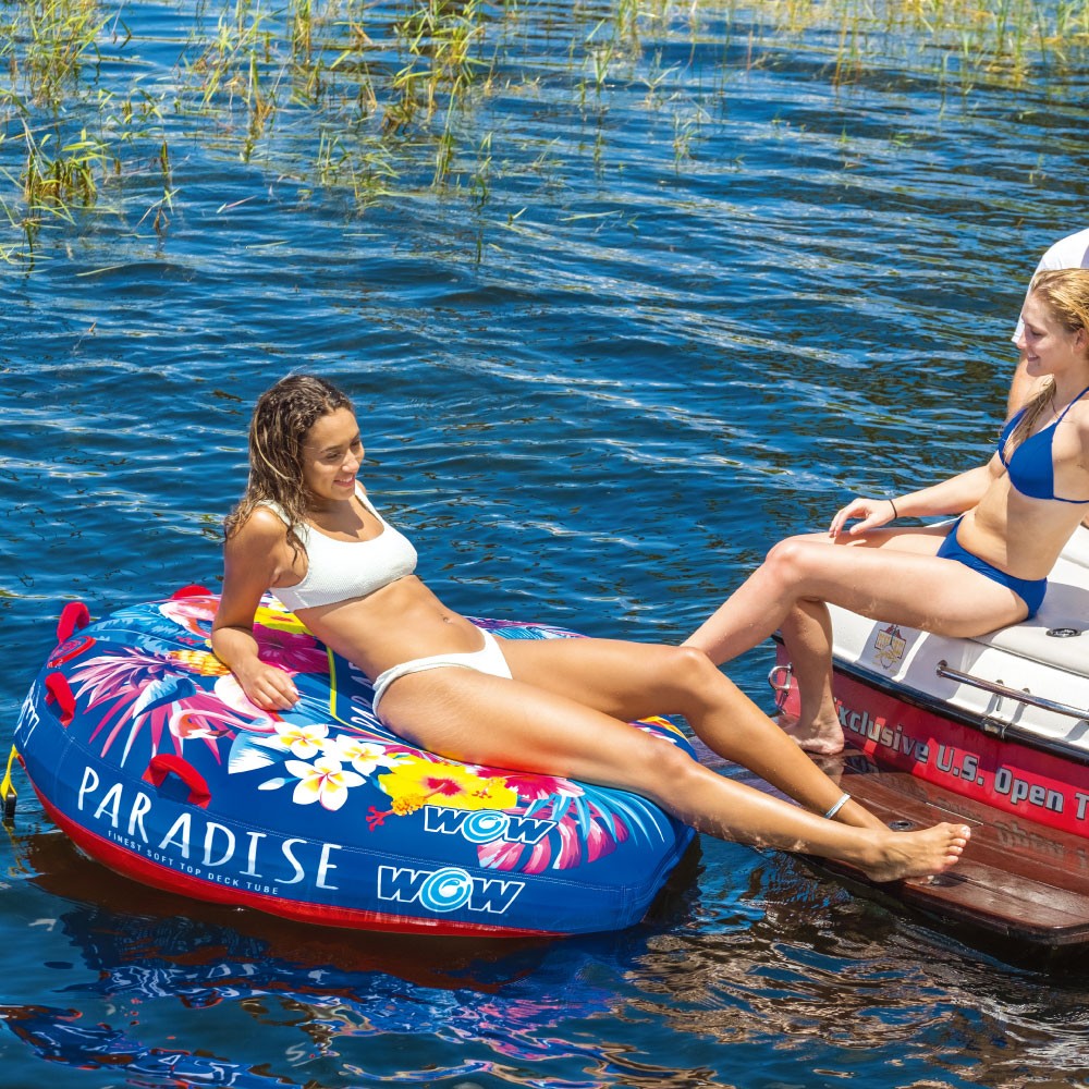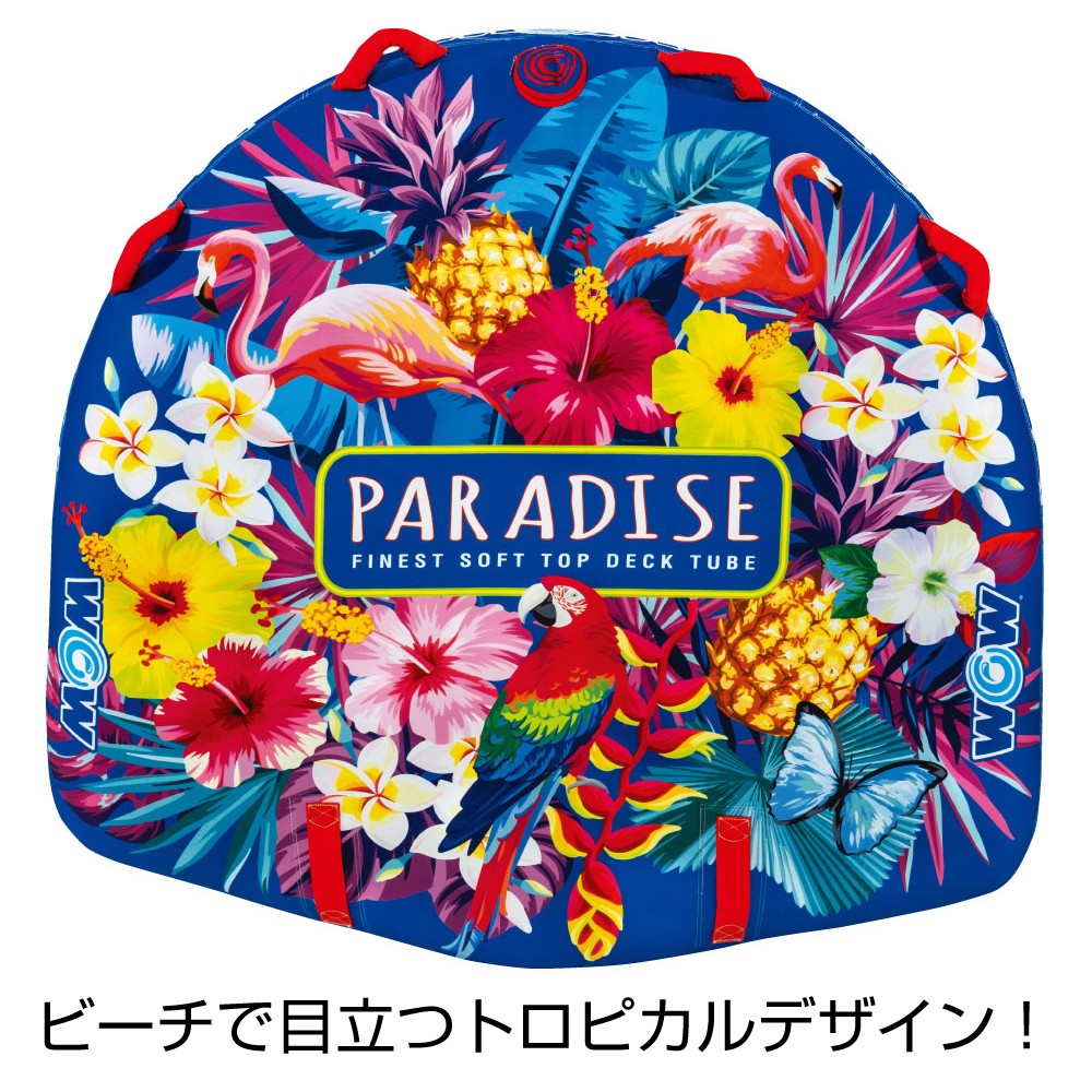 ●ビーチで目立つトロピカルデザインのデッキ型チューブ。