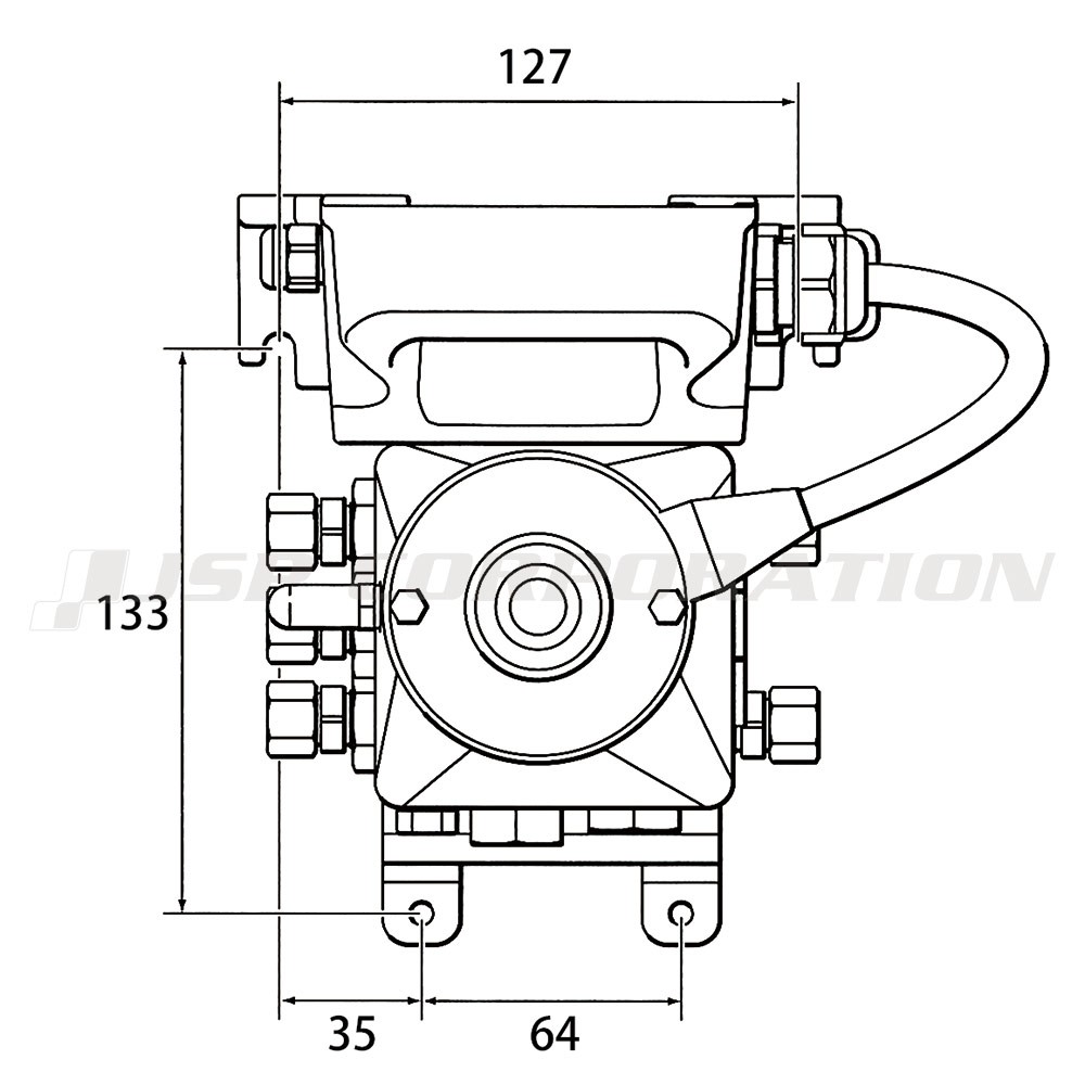 ●本体をヘルムとシリンダーをつなぐ油圧ホースに取り付けます。ボディは、床または壁面へ固定。