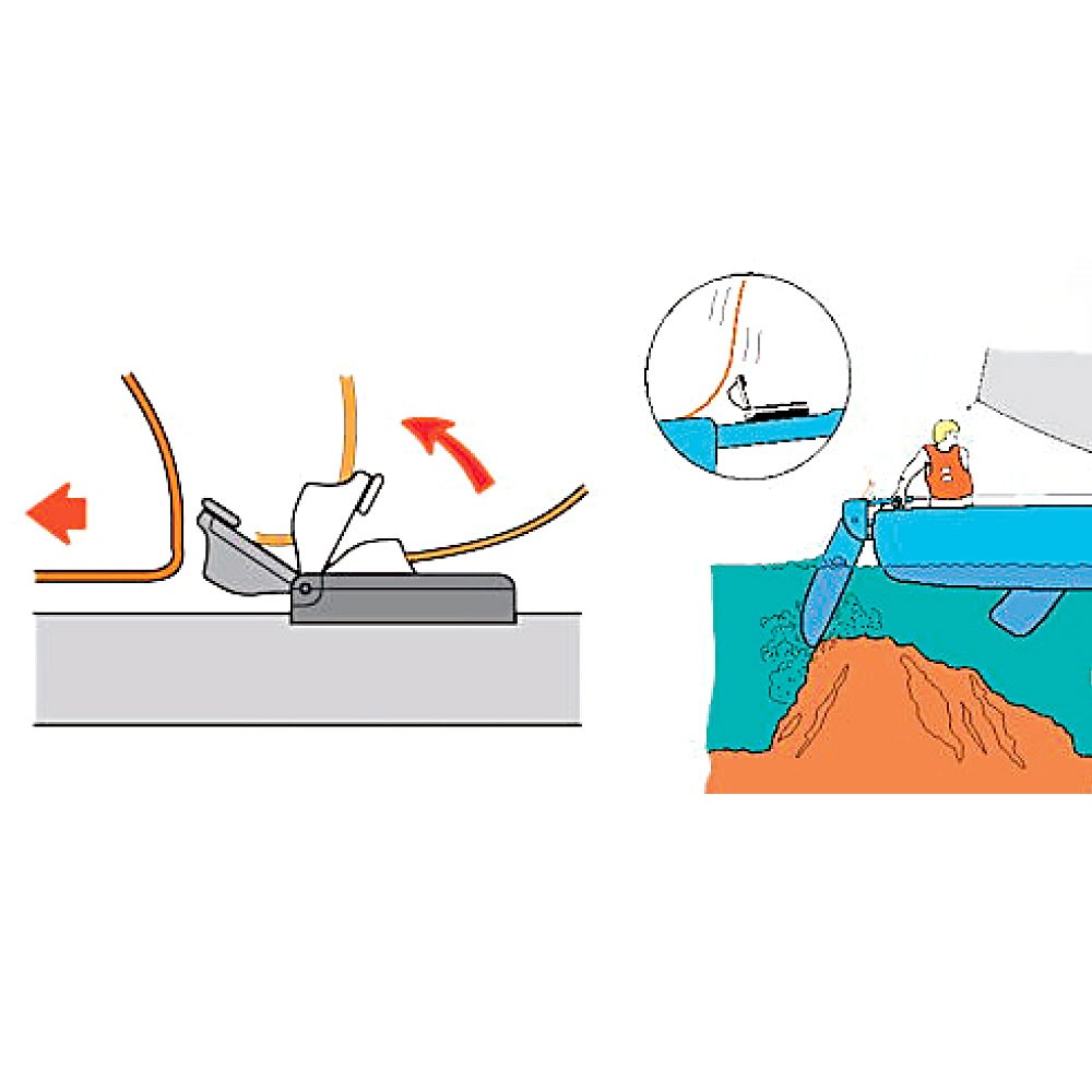 ●一定の衝撃が加わるとクリート部が跳ね上がり、ロープの保持を解除します。ディンギーなどのラダー固定に使用すると、ラダーに衝撃が加わった際に破損を防ぐことが出来ます。