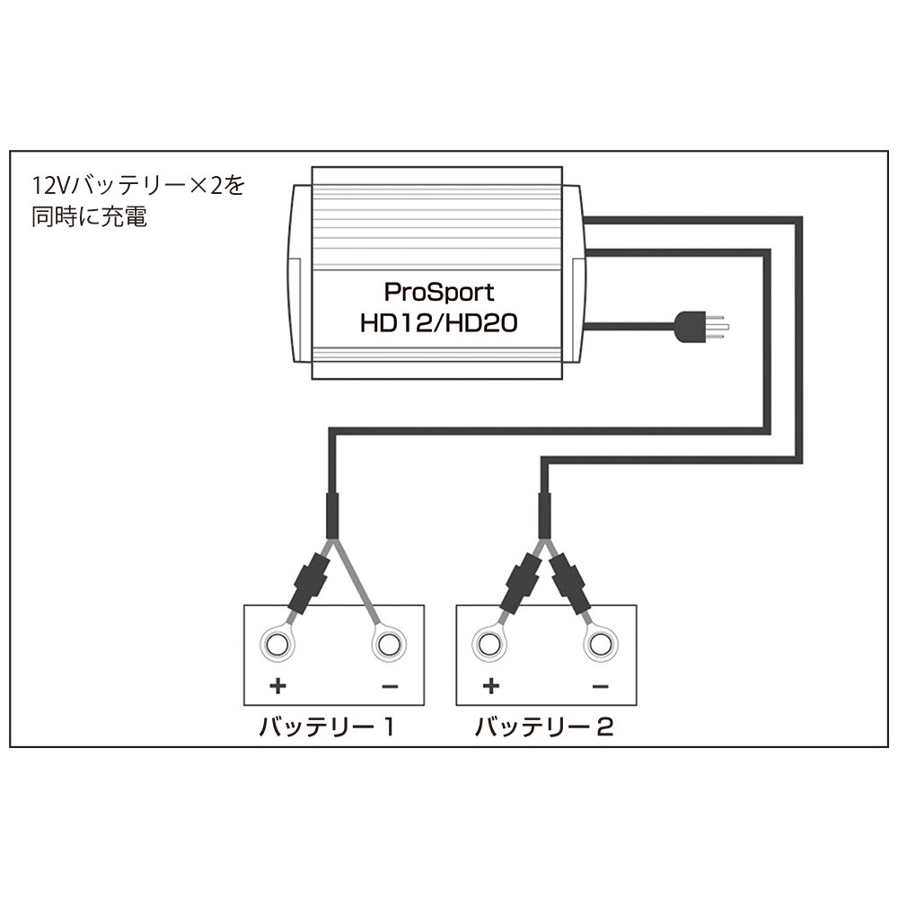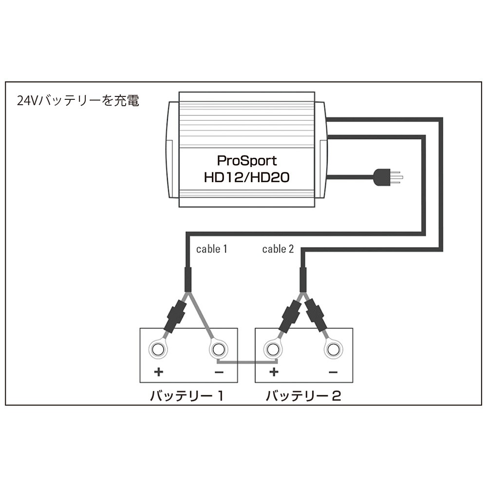 テリーを2個同時充電、または24Vバッテリーを1個充電可能