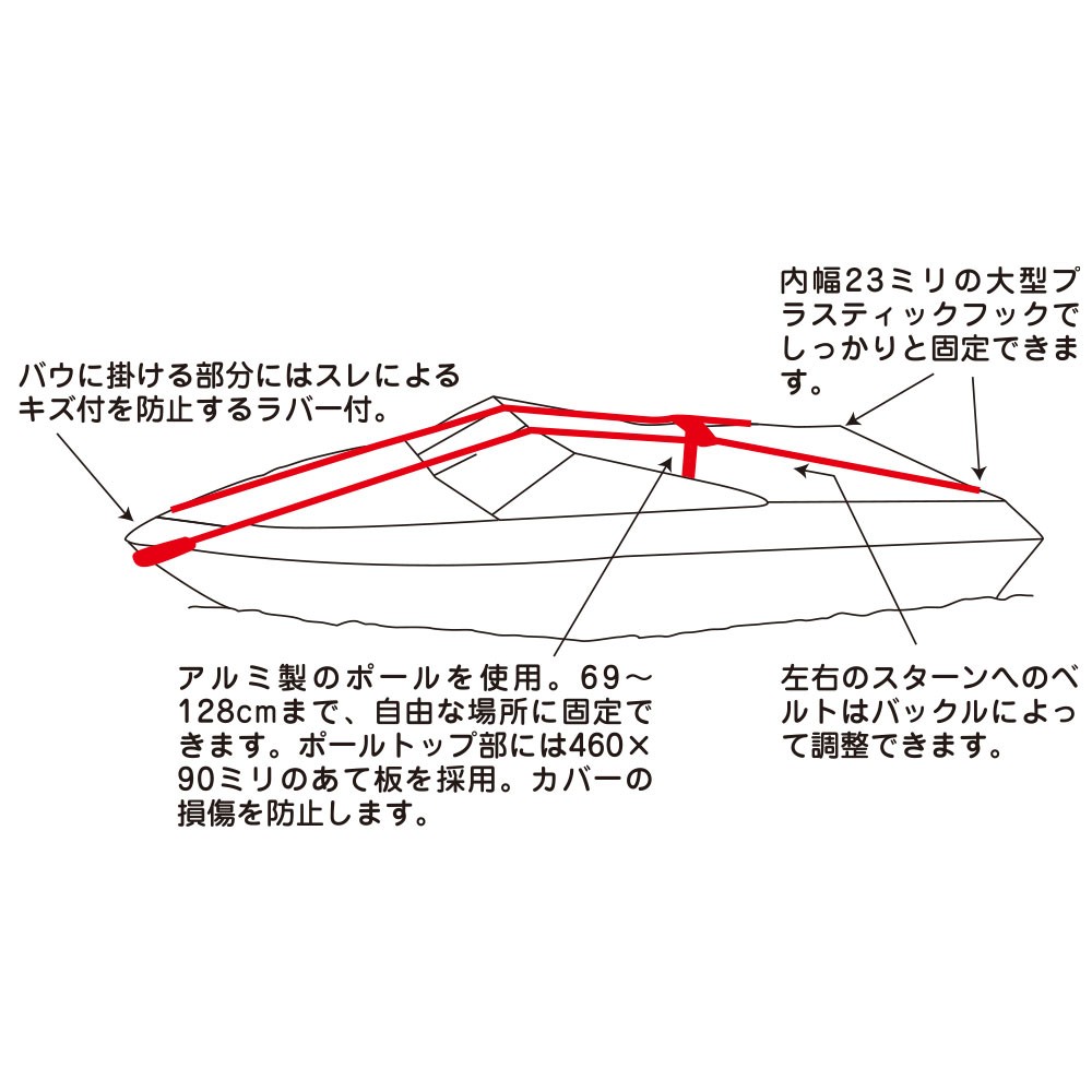 ●ボートカバーをかける前に、このサポートを取り付けることによってカバーをかけ易くし、さらにカバーにテンションを掛けながら張ることができるので、カバーに水が溜まるのを防ぎます。