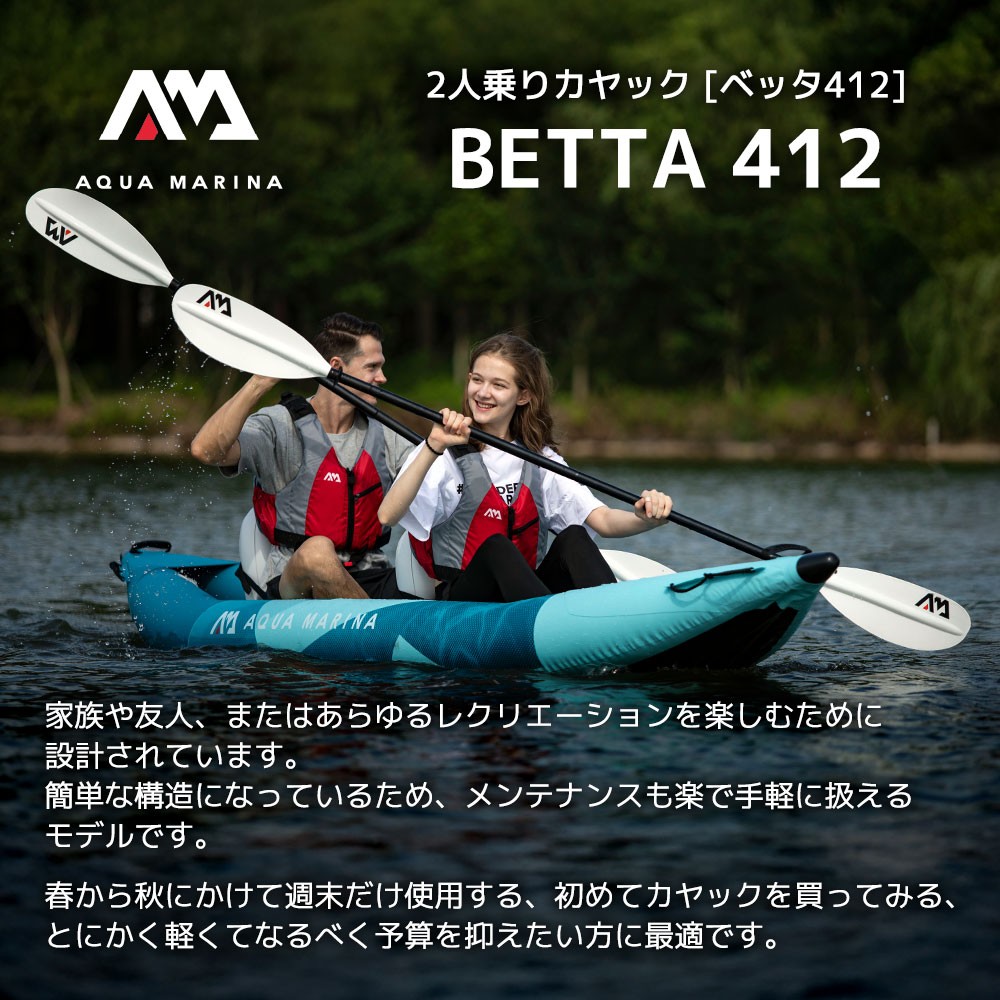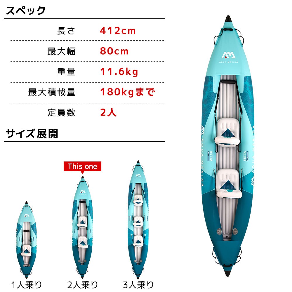 AQUA MARINA(アクアマリーナ)Betta ベッタ カヤック インフレータブル パドル付 2人乗り商品番号:BE-412-B メーカー希望価格:¥93,720 ネオプライス:¥93,720(税込) 獲得予定ポイント:930ポイント ショッピングモールでの取り扱い情報 楽天市場店 ¥93,720 Yahoo!店 ¥93,720 送料 北海道 青森県 岩手県 宮城県 秋田県 山形県 福島県 茨城県 栃木県 群馬県 埼玉県 千葉県 東京都 神奈川県 山梨県 長野県 新潟県 富山県 石川県 福井県 岐阜県 静岡県 愛知県 三重県 滋賀県 京都府 大阪府 兵庫県 奈良県 和歌山県 鳥取県 島根県 岡山県 広島県 山口県 徳島県 香川県 愛媛県 高知県 福岡県 佐賀県 長崎県 熊本県 大分県 宮崎県 鹿児島県 沖縄県 ※送料について [注意事項]※離島(全国)は沖縄県の送料になります。 入荷予定 2月頃 注意マーク 注文数量 ▲ ▼ 購入ボタン