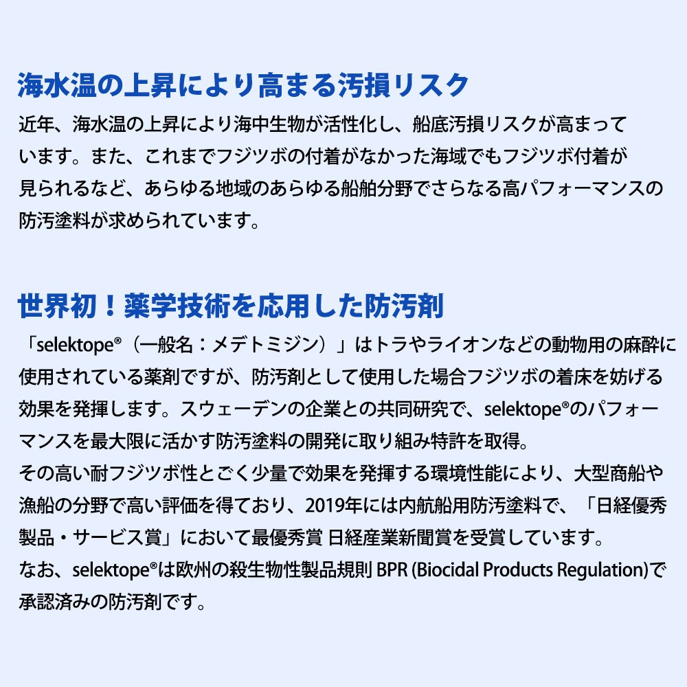なお「selektopeR」は防汚環境安全に厳しい欧州防汚剤規制「BPR(Biocidal Products Regulation)」承認済みの防汚剤です。