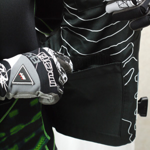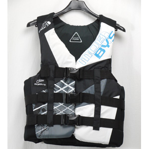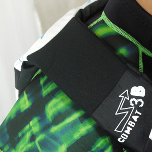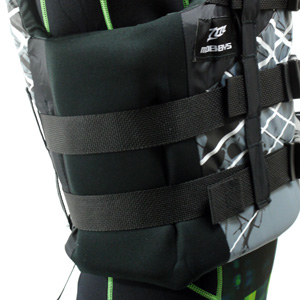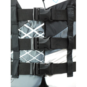 カラーごとに異なるグラフィックが特徴。3バックルのフロントオープンタイプで、肩と脇のパネルには肌に優しいネオプレンを使用しているので、着脱しやすく、しっかりフィットする。大きなバックルなのでサイズの微調整も簡単操作。