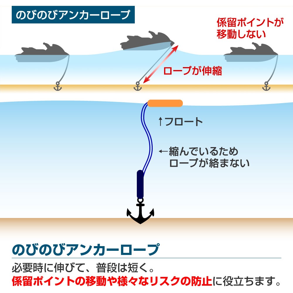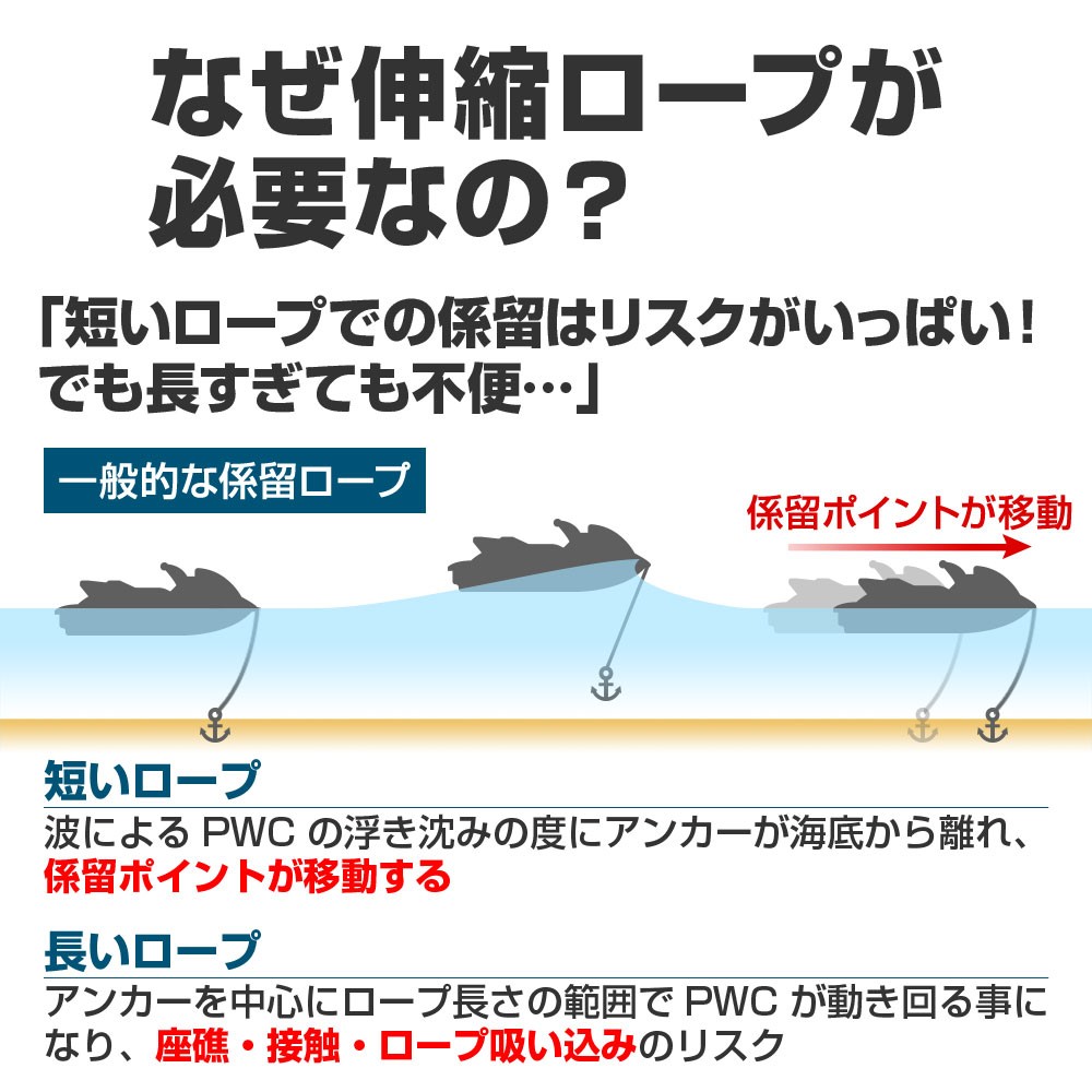 その為、利便性を考えると短いロープでPWC直下にアンカーを沈める事が理想となりますが、余裕(弛み)のない短いロープでは、波によるPWCの浮き沈みの度にアンカーが海底から離れ、最初の係留ポイントとは異なる場所まで流されてしまいます。