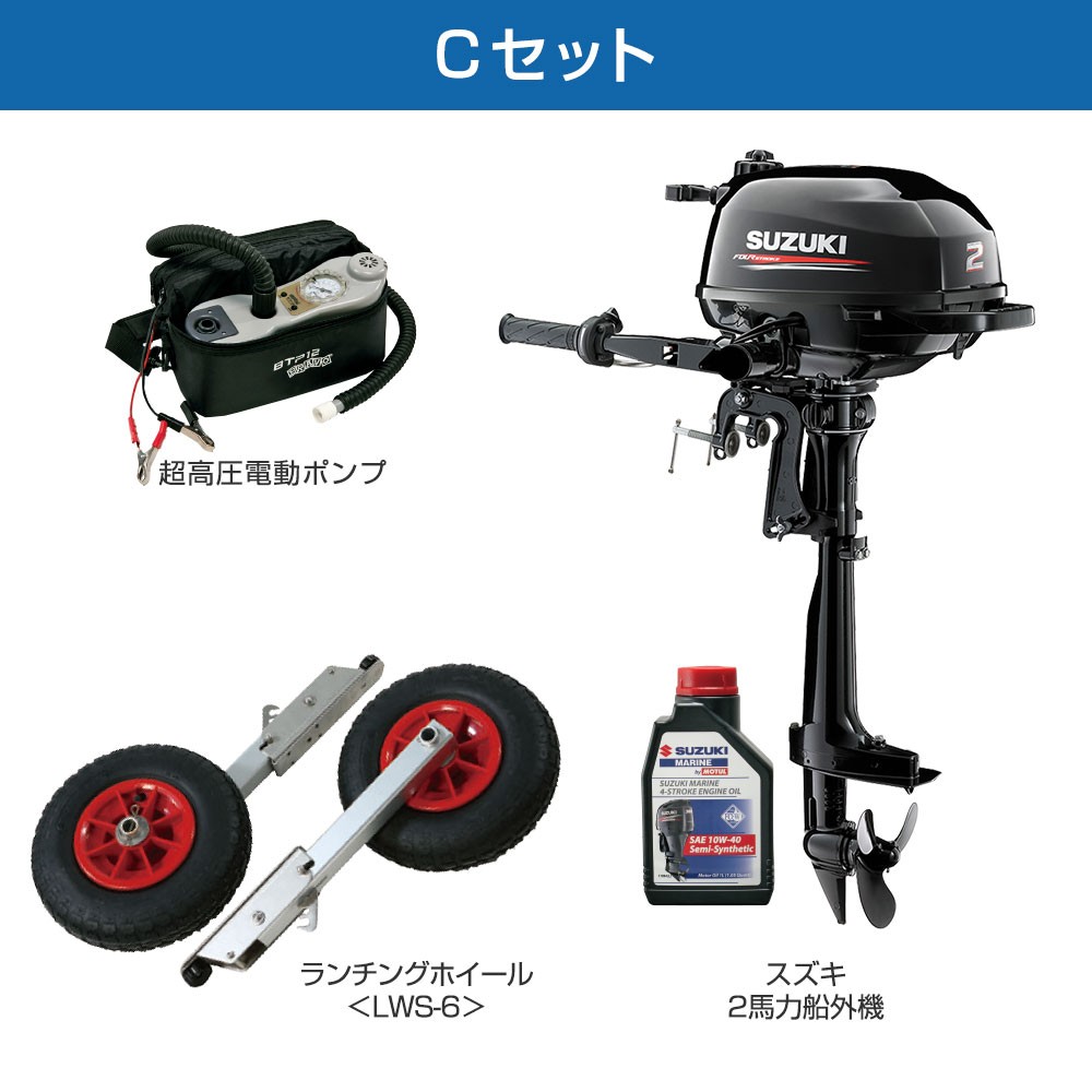 ■セット品:JCM-325ゴムボート、ランチングホイール(スライド式/32cmタイヤ)、スズキ2馬力船外機、エンジンオイル1L
