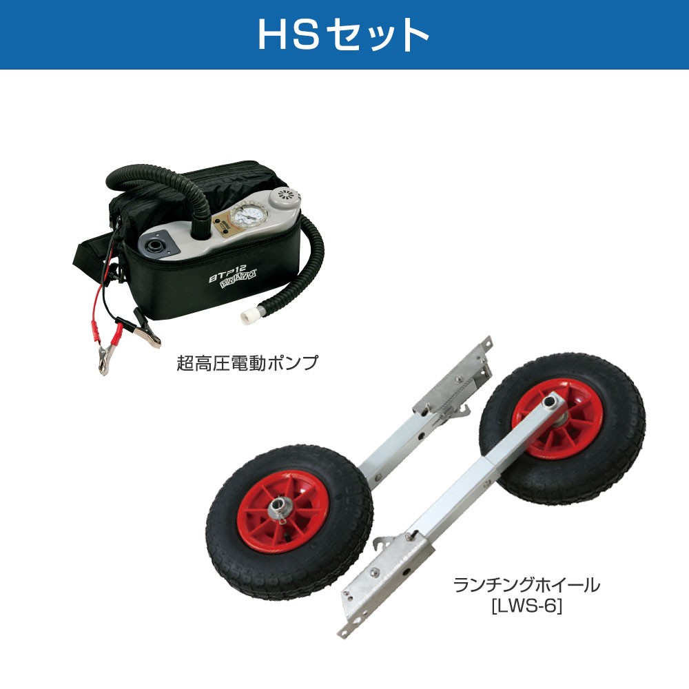 ■付属品:アルミオール、高圧フットポンプHP-9、腰掛板2枚、補修キット、キャリーバッグ、超高圧電動ポンプ、安全フラッグ