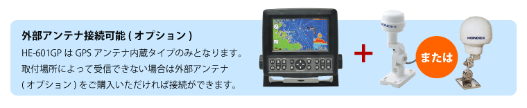 ・HE-601GPはGPSアンテナ内蔵タイプのみとなります。取付場所によっては受信できない場合は外部アンテナ(オプション)をご購入いただければ、接続ができます。