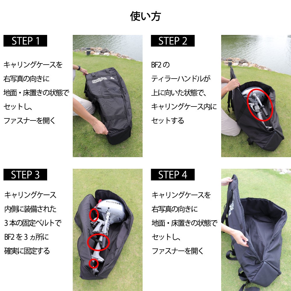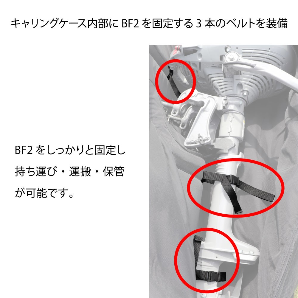 ・キャリングケースでBF2を持ち運び・運搬する場合、ケース内に装備された3本の固定ベルトで必ず船外機を固定してください。
