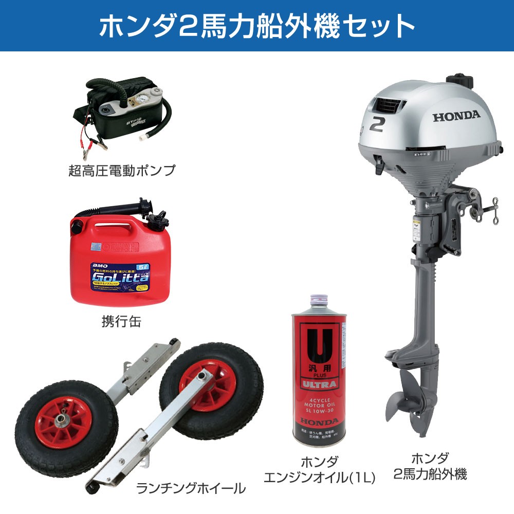 ■セット内容:パプリカ305(JPK-305)ゴムボート、超高圧電動ポンプ、ランチングホイールM、ホンダ2馬力船外機、純正エンジンオイル1L、ゴリッタ(5Lポリタンク)