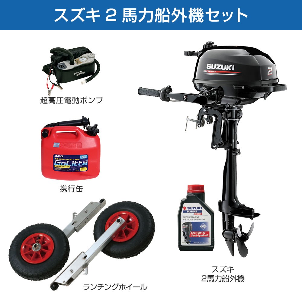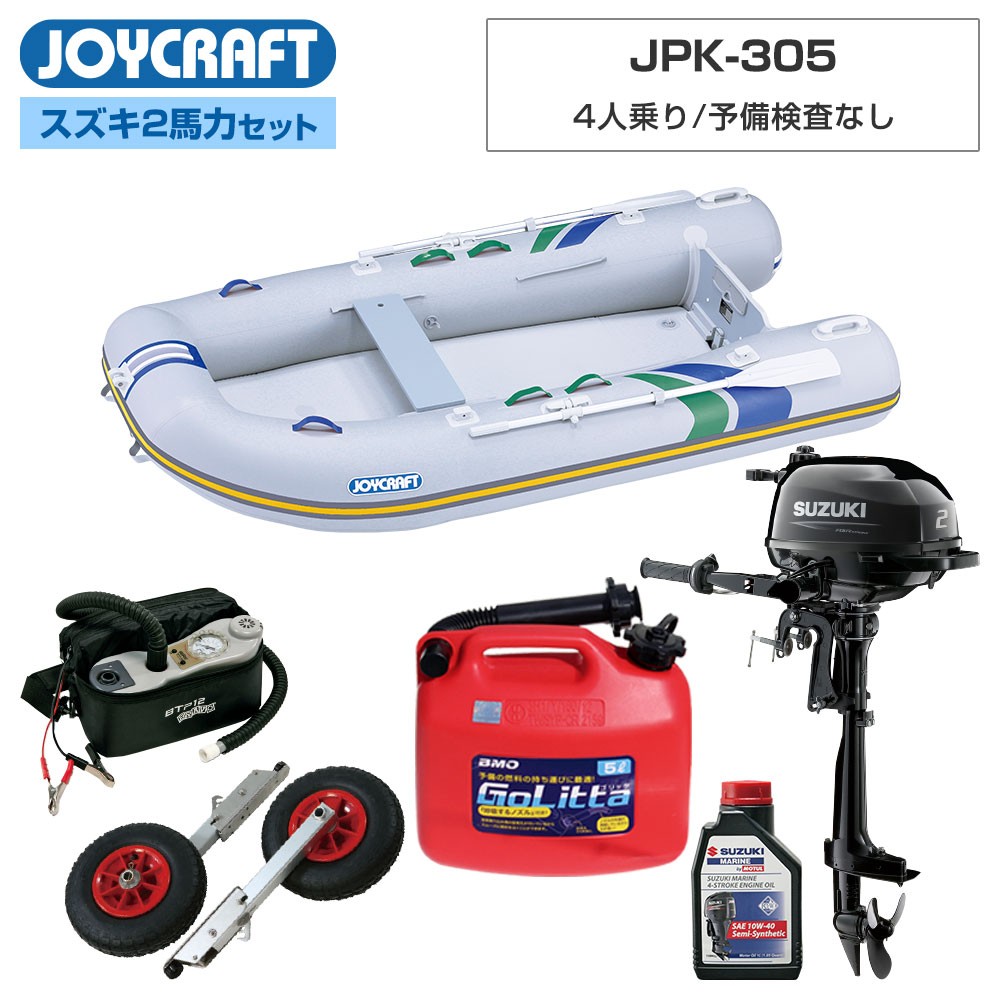 ■セット内容:パプリカ305(JPK-305)ゴムボート、超高圧電動ポンプ、ランチングホイールM、スズキ2馬力船外機、純正エンジンオイル1L、ゴリッタ(5Lポリタンク)