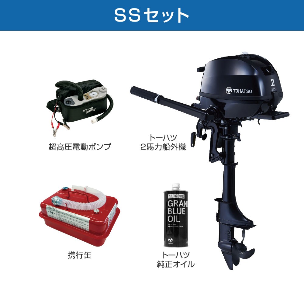 ■SSセット品:ラポッシュ260(JSL-260)ゴムボート、トーハツ2馬力船外機、エンジンオイル、4.5Lガソリン携行缶、超高圧電動ポンプ