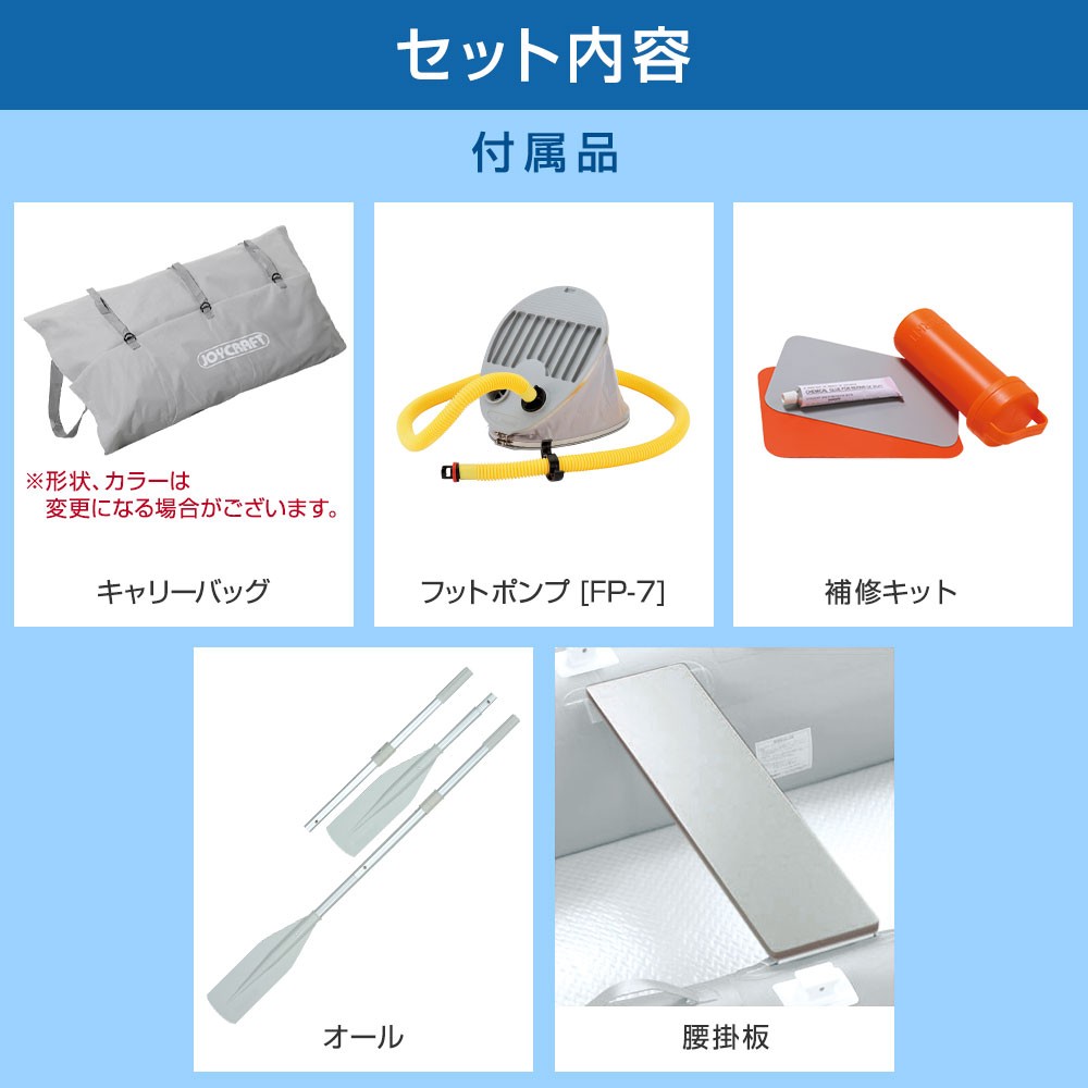 ■付属品:アルミオール、高圧フットポンプ、腰掛板1枚、補修キット、キャリーバック