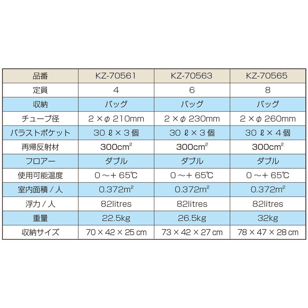 ●キャノビー(天蓋)は児童自立式で、本体のチューブは上下2段のダブルチューブ、フロアーは断熱マットを採用し、緊急時や遭難時等の場合、安全かつ快適に救助を待つことができます。