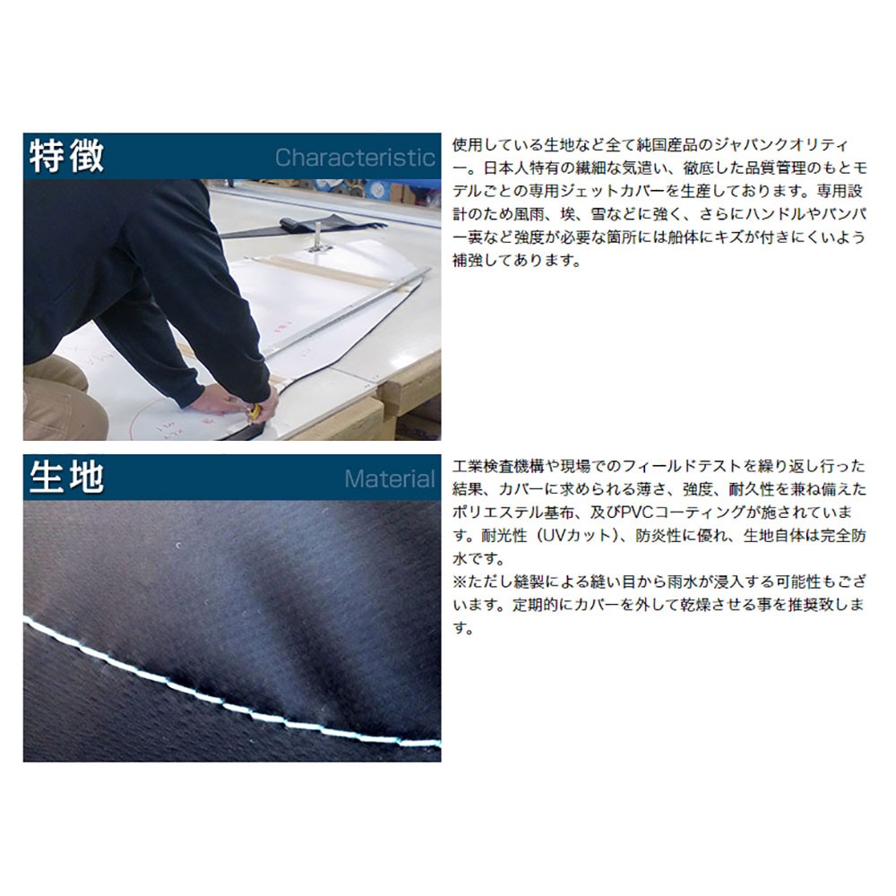 | 使用している生地など全て純国産品のジャパンクオリティー。日本人特有の繊細な気遣い、徹底した品質管理のもとモデルごとの専用ジェットカバーを生産しております。専用設計のため風雨、埃、雪などに強く、さらにハンドルやバンパー裏など強度が必要な箇所には船体にキズが付きにくいよう補強してあります。 |