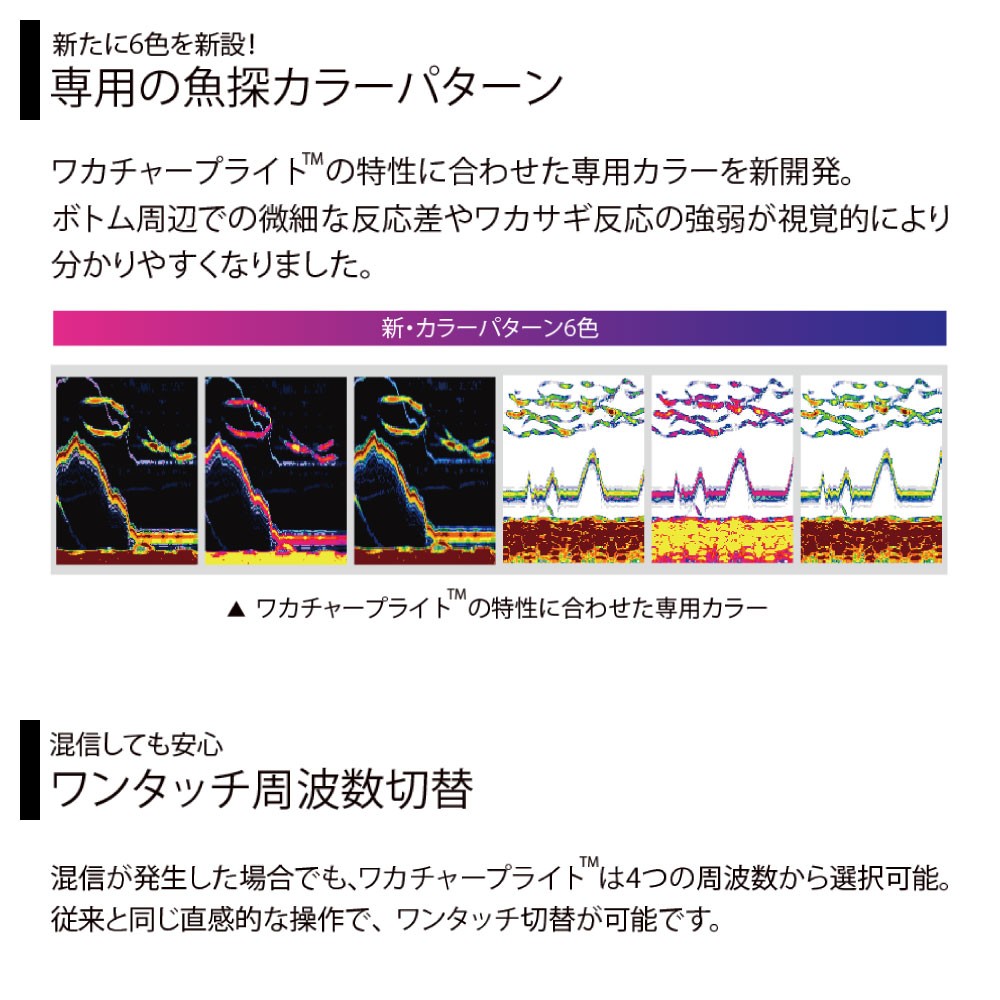 ●ワカチャーブライトの特性に合わせた専用カラーを新たに6色新設。ボトム周辺での繊細な反応差やワカサギの反応の強弱が視覚的によりわかりやすくなりました。