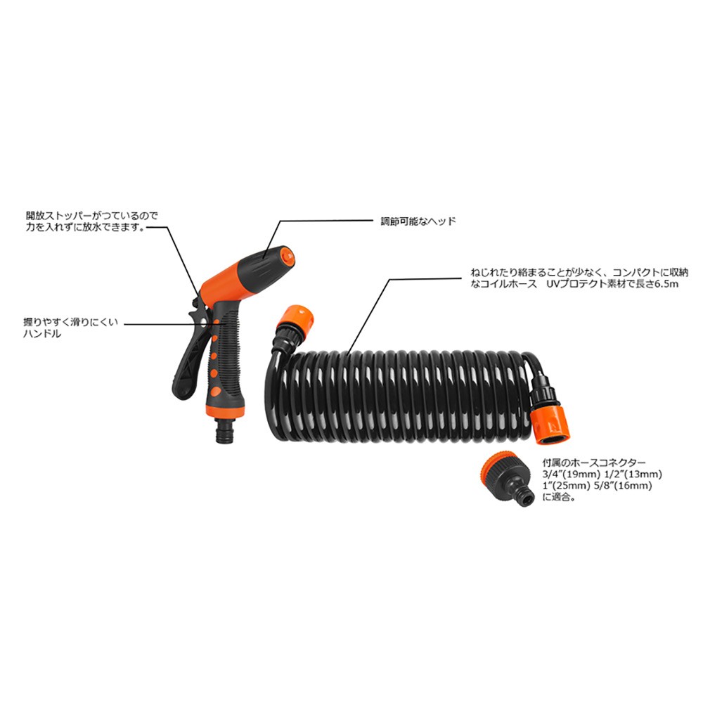 ●ホースの全長は6.5mでコイル状になっており場所を取りません。ホースを重ねてもねじれたり絡まることが少なく、しかもコンパクトに収納できます。