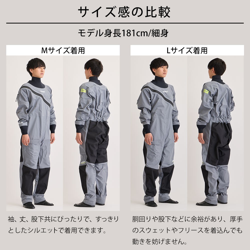 ■素材:ナイロンツイル(Transpire MAX)、YKKアクアシール、ネックシール(クロロプレーンシール)、リストシール(クロロプレーンシール)、ソックス(スーパーラテックス)