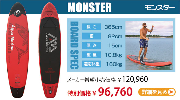 アクアマリーナのSUPの中で最大サイズで、長さ・幅・厚みが大きく、適応重量は210kgまでOK!大人の2人乗りはもちらん、更にお子様やペットとも一緒に楽しめます。ポップなデザインがかわいい、グループ使いにも人気のモデルです。