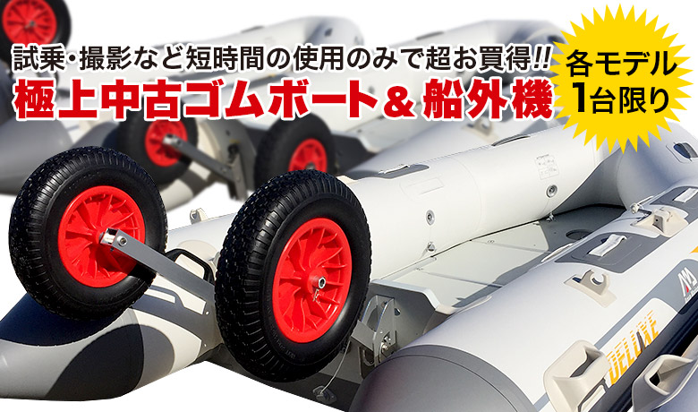 手漕ぎ用と船外機搭載型ゴムボートですが、試乗やパーツの装着確認などに使用した商品が各モデル1台ずつあり、それを今回処分致します!