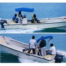 ●ハードトップのないフィッシングボート、小型ランナバウトには最適です。日陰を風が通り抜けハードトップ艇では味わえない快適な風を感じたボーティングが楽しめます。前方への折りたたみも簡単です。収納時のサポートパイプセットをオプションで用意しました。