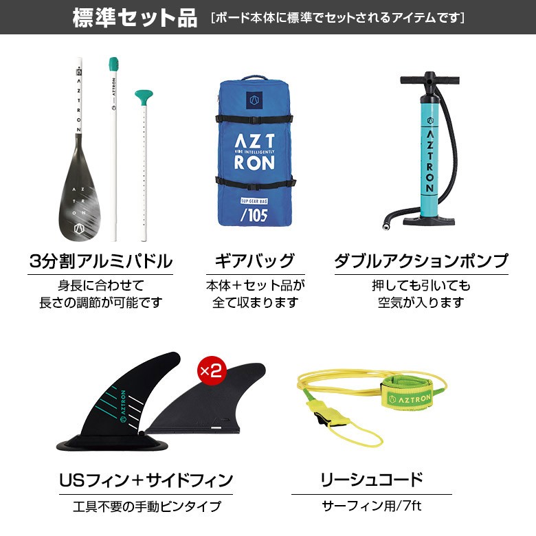 ■セット内容:SUP本体、ポンプ、バッグ、フィン(センター×1、サイド×2)、パドル、リーシュコード