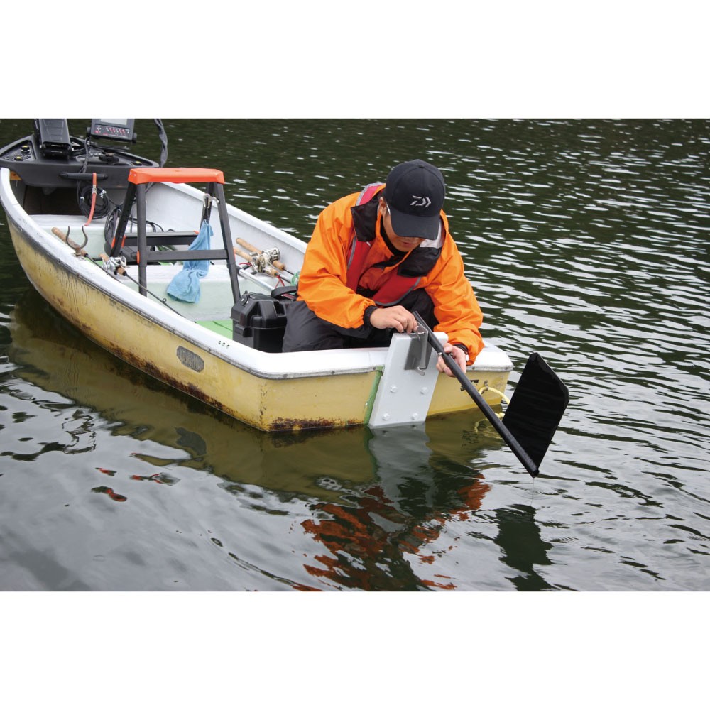 ●フットコンエレキのみで操船する場合、動力源が前方にあるため船尾が左右に振られやすく、不安定になりやすいため、思い通りに操縦するのが困難です。ボートラダーをトランサムに取り付ければ船尾の振れを最小限に抑えることができます。