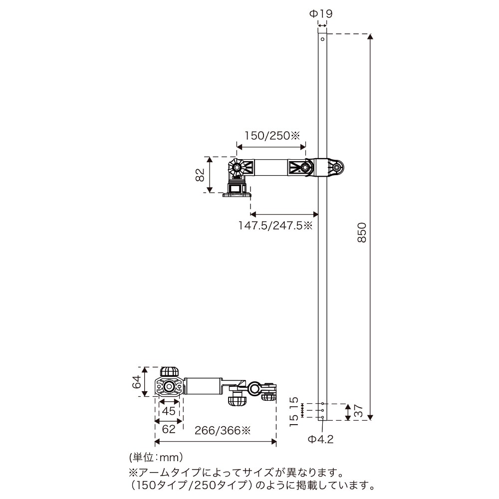 ●Φ19mmのアルミ製パイプと樹脂製パーツで構成されたスマートなフィッシュセンサーアームです。