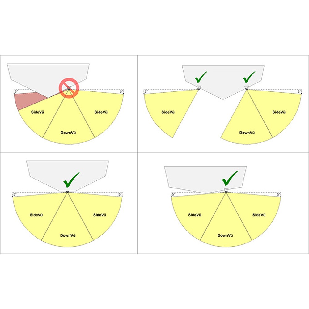 ●ハルの形状がV型で角度が大きく、サイドビューが反対に届かない場合、2つ振動子を取り付ける必要があります。