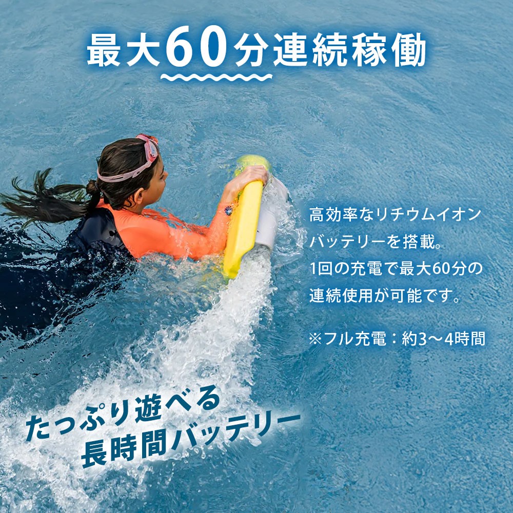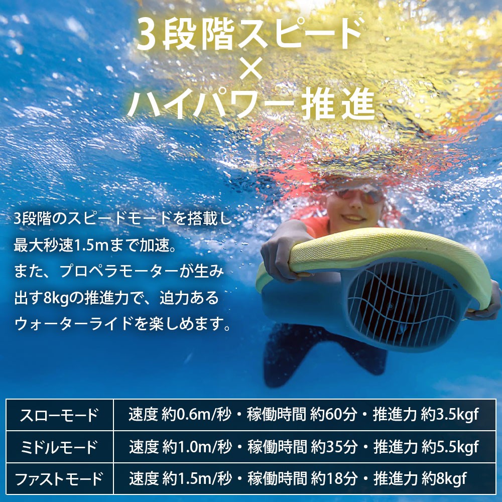 ●3段階のスピードモードを搭載し、最大秒速約1.5m(5ft/s)まで加速。8kgの推進力で、迫力あるウォーターライドを体感できます。