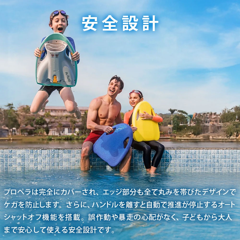 ●プロペラは完全にカバーされ、エッジ部分もすべて丸みを帯びたデザインでケガを防止します。さらに、ハンドルを離すと自動で推進が停止するオートシャットオフ機能を搭載。