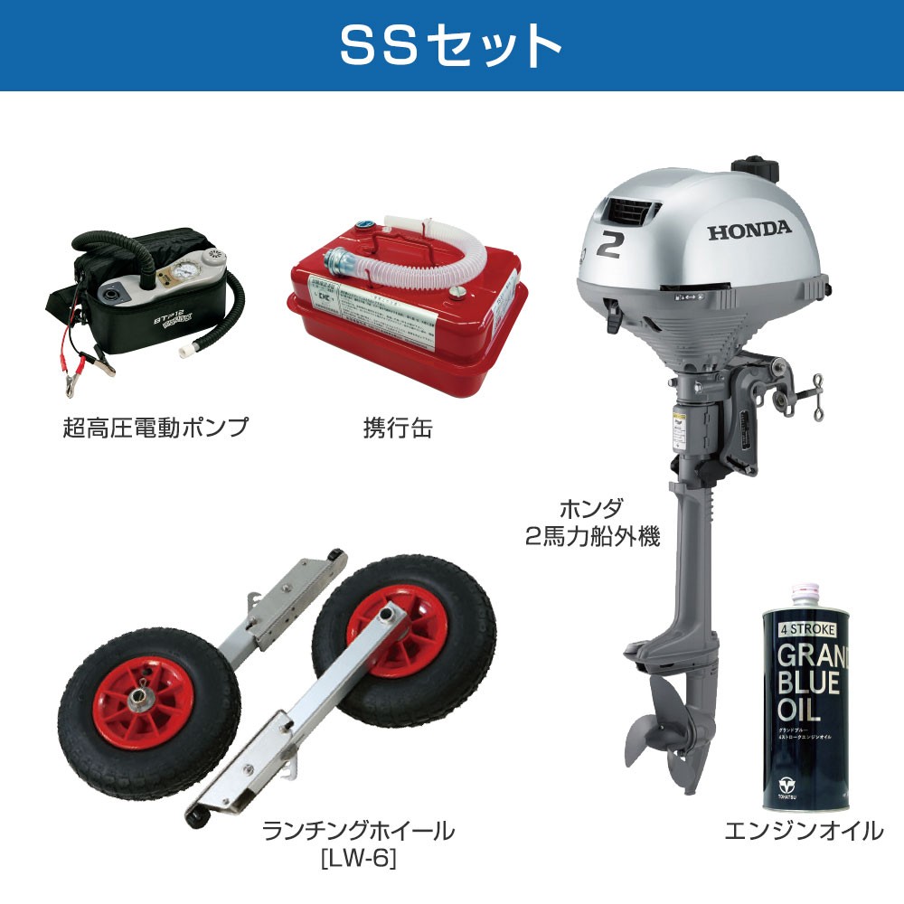 ■SSセット品:パプリカ325(JPK-325Q)ゴムボート、ランチングホイール(LW-6)、ホンダ2馬力船外機、4.5Lガソリン携行缶、エンジンオイル、高圧電動ポンプ