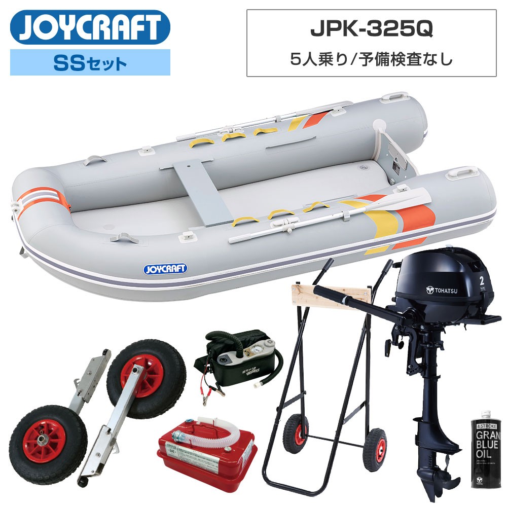 ■SSセット品:パプリカ325(JPK-325Q)ゴムボート、ランチングホイール(LW-6)、トーハツ2馬力船外機、4.5Lガソリン携行缶、エンジン架台、エンジンオイル、高圧電動ポンプ