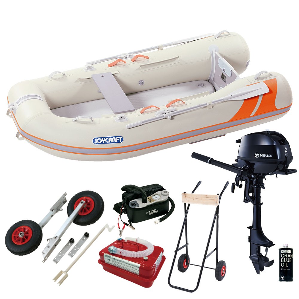 ■SSセット品:ラポッシュ260(JSL-260)ゴムボート、トーハツ2馬力船外機、エンジンオイル、4.5Lガソリン携行缶、超高圧電動ポンプ、エンジン架台、ランチングホイールM