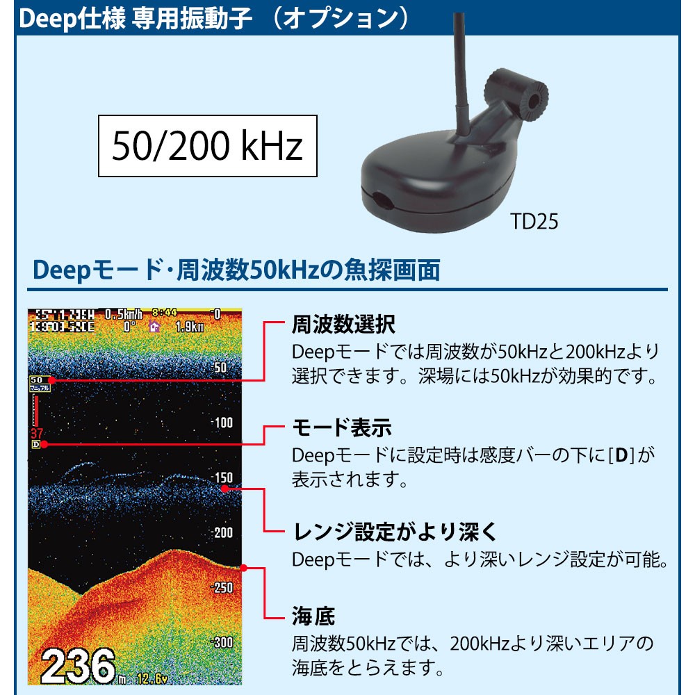 ●使用する水深に応じて本体のモードを切替可能。魚探モードを「ディープ」に設定し、振動子TD25を接続すると魚探周波数を50kHzと200kHzから選択できるようになります。50kHzは200kHzよりもさらに深い水深まで届く特性があり、200kHzが届かないようなエリアでの釣りに大変役立ちます。