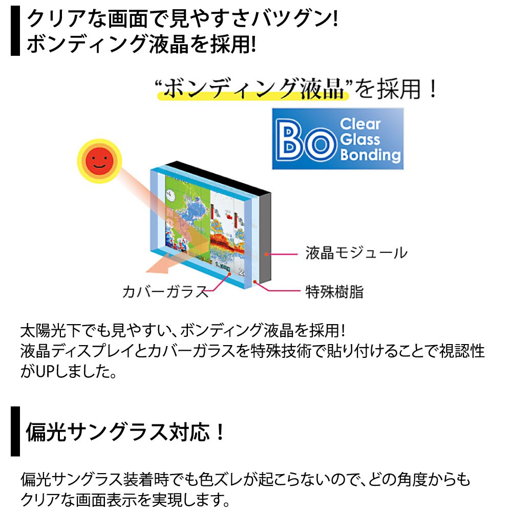 太陽光下でも見やすい、ボンディング液晶を採用し視認性がUP。明るく見やすい!偏光サングラスにも対応。