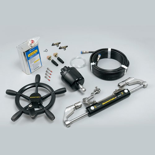 ■キット内容:キャプテンハンドル角有り(SEAPARTNERロゴ入り)、高圧樹脂ホース両端SUS金具付(HNH-06-15MC-SUS)、空気抜き三方継ぎ手(BKJ-30MX-06) 2個、キャンパカ金具(CFTG-06CZP) 2個、座付きエルボ(BKJ-50-06/90°エルボ) 2個、ヘルムポンプ(H-618-2)、ヘルムポンプ取付けボルトキット(SB-M60×50-SET)、空気抜きチューブ(VT-1)、作動油(HF-15-1.8SH)、シリンダー(左レバー)