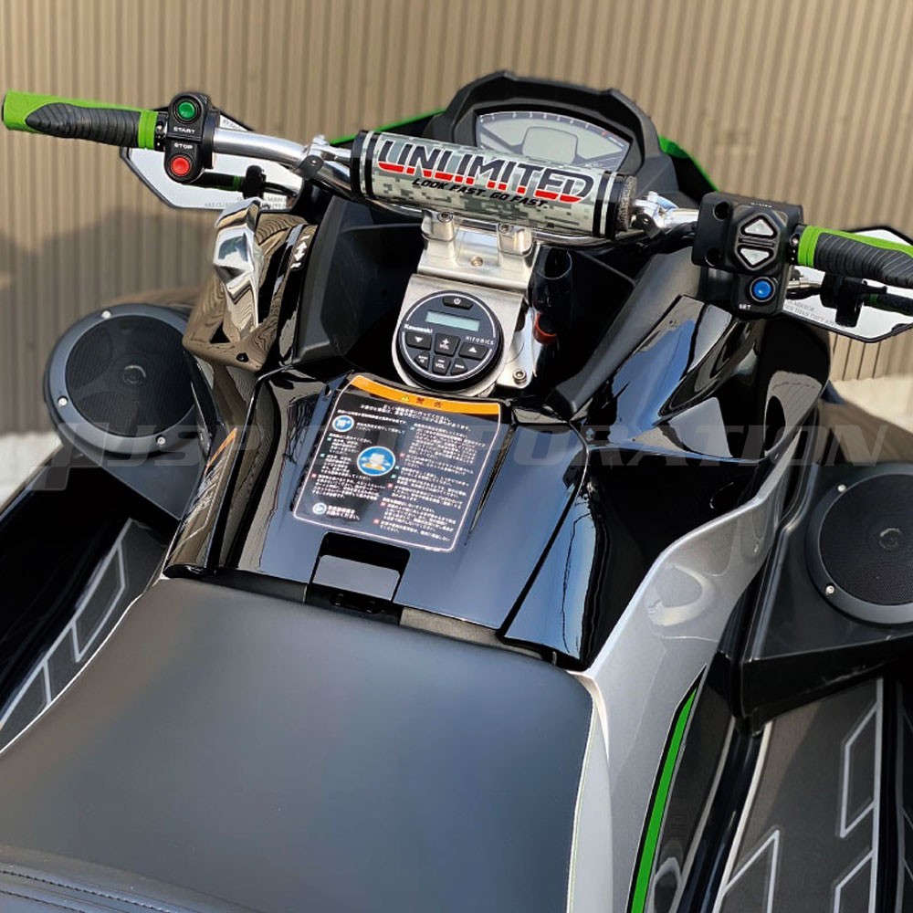 ●KAWASAKI STX-160LXに装備されているJETSOUNDオーディオシステム、ステアリングマウント交換時にオーディオアンプの操作性を損なわずに、固定することができるアンプステーです。