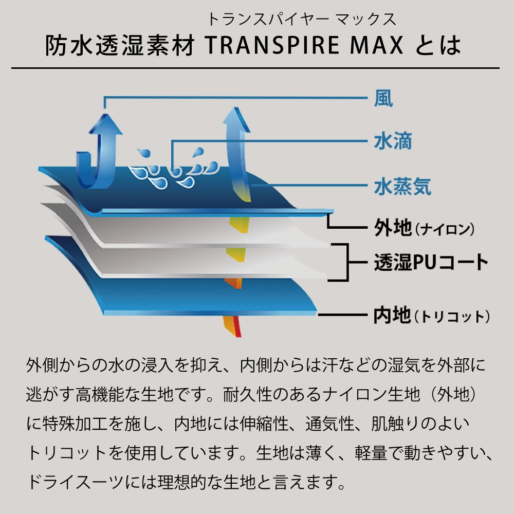 ■素材:ナイロンツイル(Transpire MAX)、YKKアクアシール、ネックシール(クロロプレーンシール)、リストシール(クロロプレーンシール)、ソックス(スーパーラテックス)